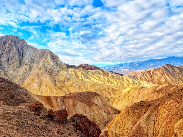 Red Cathedral can be reached via a side trail on the Golden Canyon side of the Golden Canyon Gower Gulch Loop. If you have the time, this spot is so worth a visit. After about half a mile you’ll reach a spot that looks like a small slot canyon/rock slide area. From here you’ll have to do a small amount of scrambling and climbing through slots in the rock to get to the point pictured above. After the last scramble you’ll reach a fork where it looks like the path continues to the left, but before you explore that area don’t miss the small hill to the right that takes you to a platform with a lookout spot over this side of the valley. This is a great spot to sit for a bit, have a snack, and enjoy the views before continuing on the loop trail.