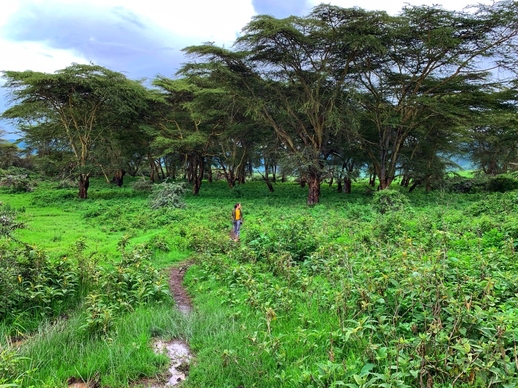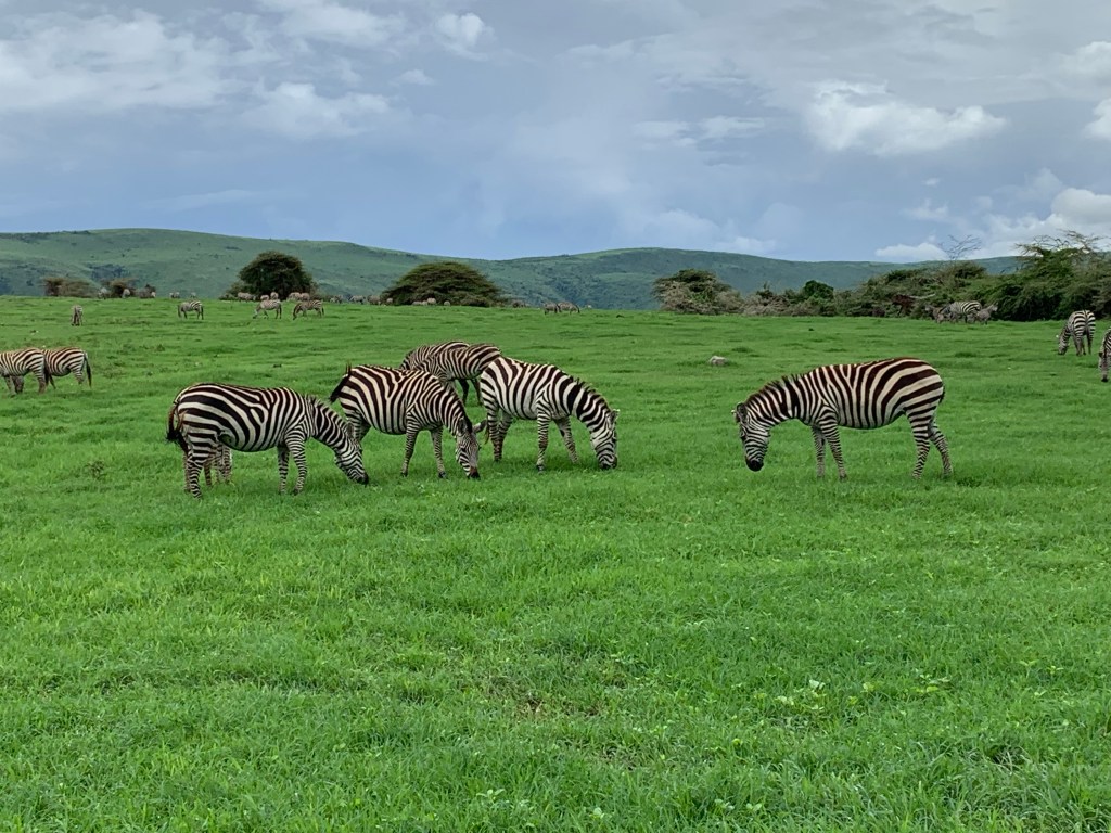 The trepidation now reignited, we made our way to the Ngorongoro Crater. This protected UNESCO World Heritage site is the world’s largest inactive, intact, unfilled volcanic crater. From a viewpoint above we looked down at the crater before making our way down to the craters floor. We had seen several herds of zebra on previous drives, but the number of zebra in the crater area was staggering. The contrast of the bright green landscape and hoards of black and white animals roaming around was beautiful. We saw our first and only rhino on this drive, albeit from quite a distance. The wildlife viewing inside the crater was some of my favorite on this trip. I was nervous to make the trek back out of the crater in our less-than-trusty vehicle, but Arnold got us out of there like a pro and got us to our next location.